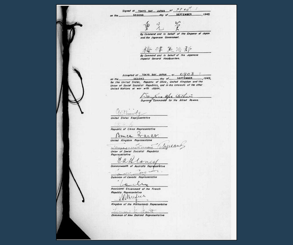 2 вересня 1945 року о 9:04 ранку за токійським часом в Токійській затоці на борту лінкора «Міссурі» було підписано Акт про капітуляцію Японії, що остаточно завершив Другу світову війну.